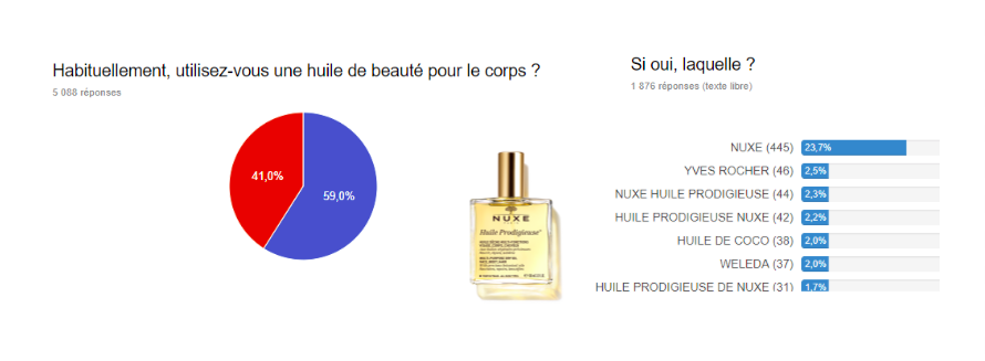 Sur 5088 répondants, la marque la plus citée spontanément est Nuxe à environ 30%. Néanmoins ce chiffre est à modérer par le fait que les Françaises achètent des huiles de beauté ailleurs qu’en pharmacie, notamment en boutique de marque, en grandes et moyennes surface ou encore en ligne.