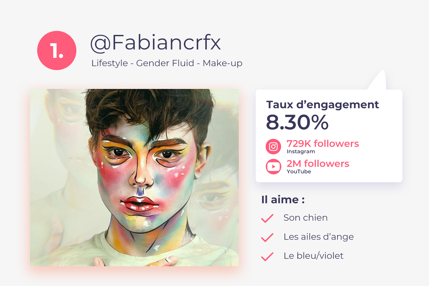 C’est l’influenceur et blogueur homme de France à ne pas manquer ! Du haut de ses 19 ans, @fabiancrfx, l’influenceur maquillage, est suivi par plus de 2 millions de personnes sur le réseau social Tik Tok et près de 730 000 sur Instagram. Véritable influenceur lifestyle, ce makeup artist non binaire casse les codes du genre à travers ses nombreux posts photos et vidéos sur les réseaux sociaux ! Etre un homme est un sexe qui ne définit en rien le look ou le comportement à adopter affirme t-il à plusieurs reprises ! Autant classiques qu’extravagants, les photos et images de ses makes up séduisent par leur professionnalisme et leur style. Ne manquez pas Fabian, ce gender fluid à la créativité débordante et qui assume SA propre identité auprès de sa communauté ! Découvrez son travail ainsi que sa beauté à la fois masculine et féminine à travers ses posts instagram.