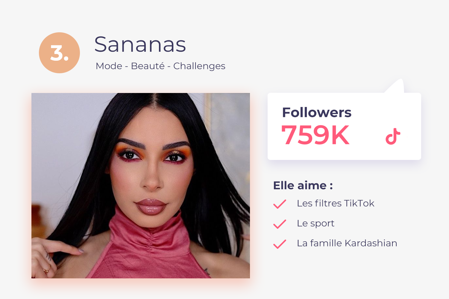 Sananas, est une YouTubeuse et blogueuse mode/beauté dépassant les 2 millions d’abonné·es sur son compte Instagram. Cette belle brune aux airs de Kim Kardashian a déjà collaboré avec de nombreuses marques de luxe. Aujourd’hui sa popularité et son professionnalisme dans le domaine de la beauté ne sont plus à prouver ! Elle réunit une communauté passionnée de mode et de maquillage similaire au clan Kardashian-Jenner. Elle a fait son arrivée sur l’application qui explose ces derniers temps, TikTok. Sur ce réseau social, la youtubeuse suit le mouvement et exploite toutes les fonctionnalités qu’il offre. Elle réalise des challenges qui font le buzz, des vidéos beauté (mais pas que) à visée humoristique. Par exemple, l’influenceuse beauté a réalisé un challenge qui consiste à se maquiller en ajoutant un filtre TikTok déformant.